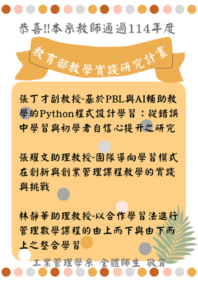 恭賀~本系張丁才副教授、張耀文助理教授 ,林靜華助理教授通過 114年度教育部教學實踐研究計畫